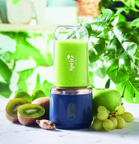 Portable smoothie blender, mixer with 6 leaf blade and 2 removable juice cups in PCTG with strap. USB Rechargeable 1200 mAh battery. Capacity: 400ml (2 x).