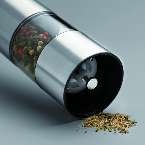 Stainless steel electric salt or pepper mill. Ceramic grinder. 4 AA batteries required (not included)