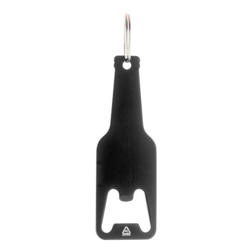 Bottle shaped recycled aluminium bottle opener with metal keyring.
