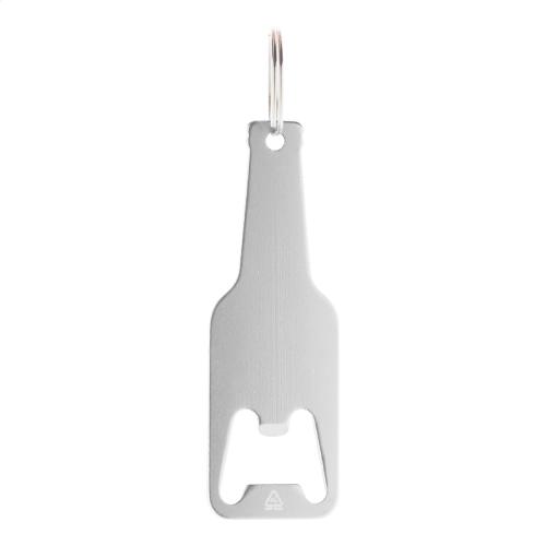 Bottle shaped recycled aluminium bottle opener with metal keyring.