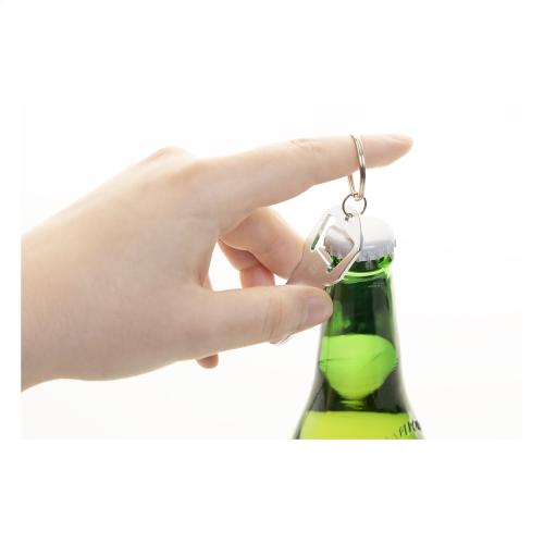Recycled aluminium bottle opener keyring with shopping trolley coin.