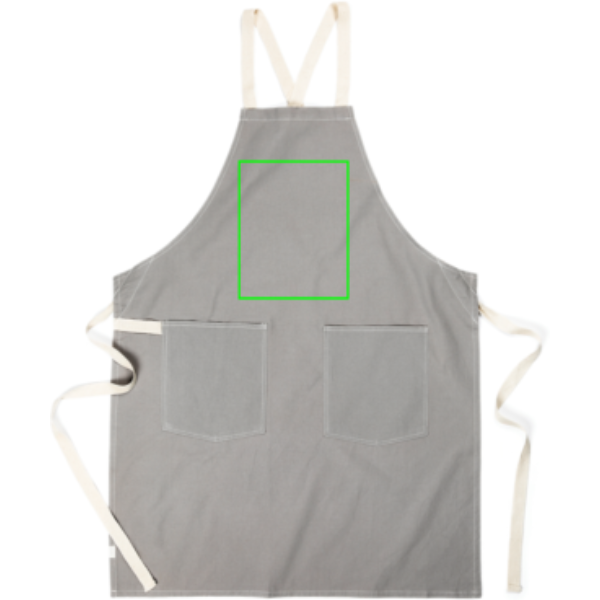 Apron made from 70% certified recycled cotton from suppliers' cotton waste. Fibres that are usually considered unusable have, with the appropriate manufacturing process, achieved the desired properties. This apron is extra wide to provide maximum protection. Two large front pockets and a loop for hanging utensils or a tea towel.
