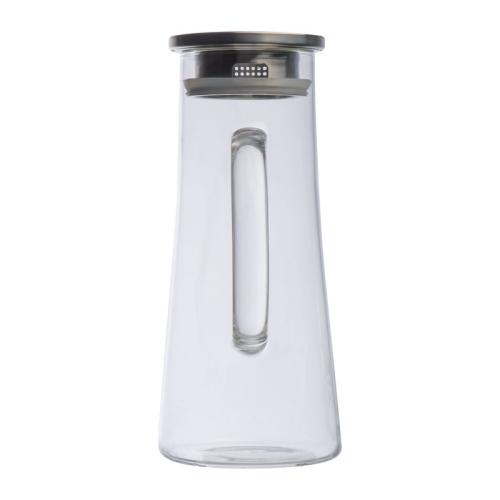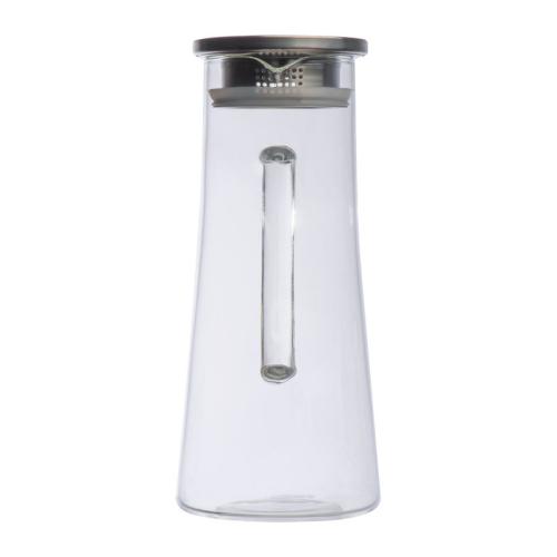 Glass carafe with stainless steel cap and 1350 ml capacity. The cap has 2 different openings: a sieve and a large opening.