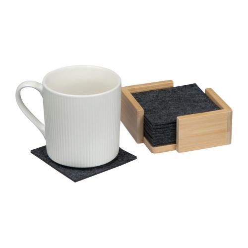 10 square coasters made of RPET felt in a bamboo stand.
