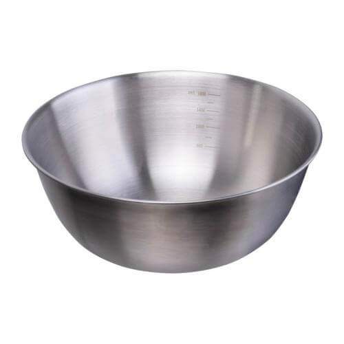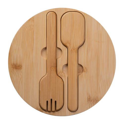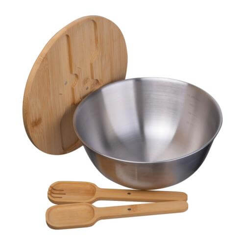 Stainless steel salad bowl with bamboo lid including cutlery and 2000ml capacity.