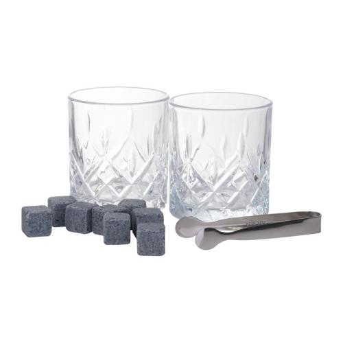 Whiskey set with two borosilicate glasses (250 ml), 6 granite ice cubes, and tongs in a premium bamboo box.