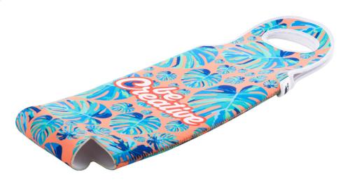 Custom made, RPET neoprene wine bottle holder bag with handles. With all over sublimation printed graphics. MOQ: 25 pcs.