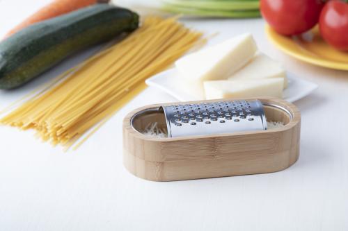 Stainless steel cheese grater with bamboo tray.