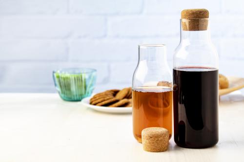 Borosilicate glass water carafe with cork lid, 600 ml. Suitable for both cold and hot drinks, it can be also used as a decanter bottle.