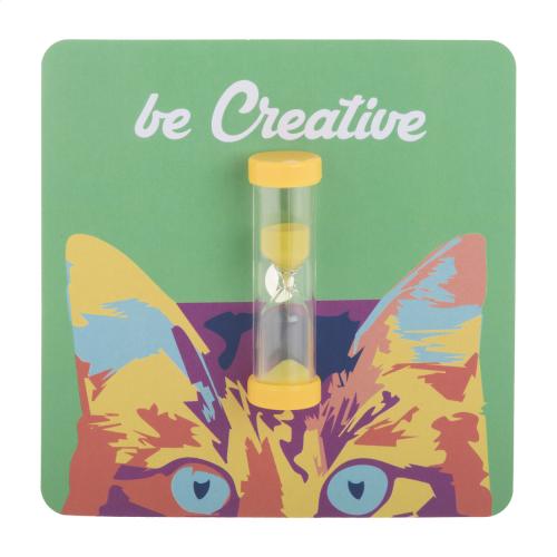 Plastic, 3 minutes sand timer with matching colour sand and suction cup holder. Customise it with paper insert!