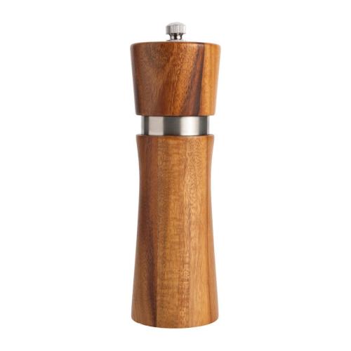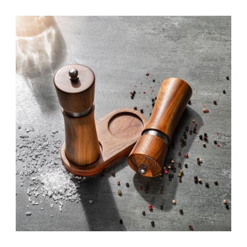 Vanilla Season elegant salt and pepper mill set with a stand. The grinders are made of acacia wood with a stainless steel accessory. The grinding stones are ceramic. Packaged in a gift box.