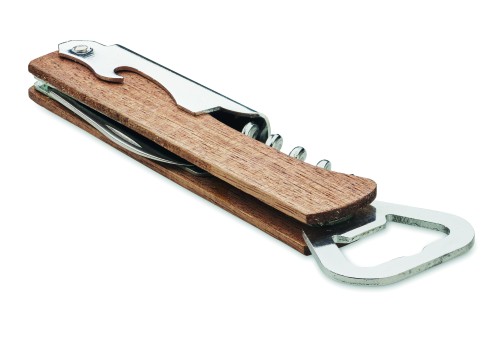 3 in 1 bottle opener in acacia wood case. It includes a corkscrew, 2 bottle openers and foil cutter.