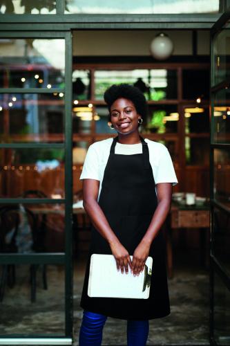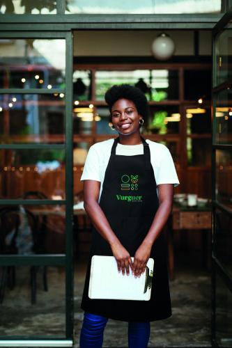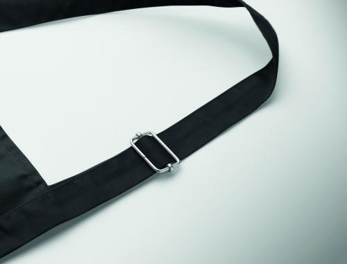 Long adjustable kitchen apron in 240 gr/m² polycotton (35% cotton, 65% polyester) with two front pockets and adjustable strap with metal buckle.