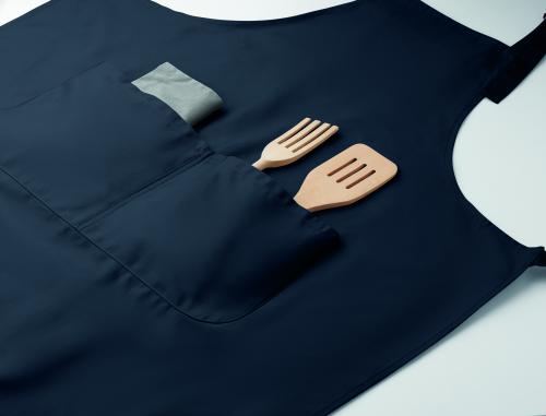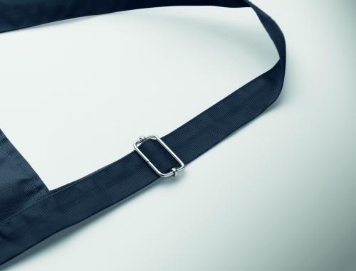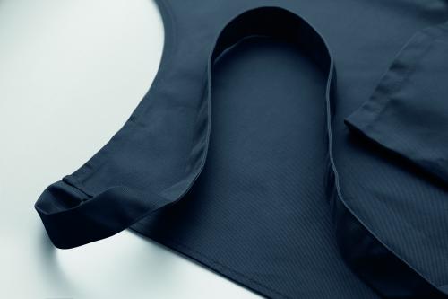 Long adjustable kitchen apron in 240 gr/m² polycotton (35% cotton, 65% polyester) with two front pockets and adjustable strap with metal buckle.