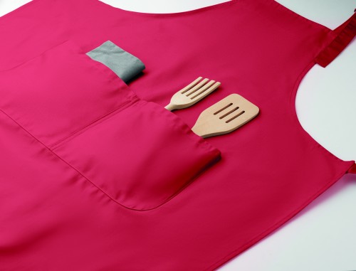 Long adjustable kitchen apron in 240 gr/m² polycotton (35% cotton, 65% polyester) with two front pockets and adjustable strap with metal buckle.