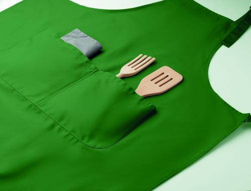Long adjustable kitchen apron in 240 gr/m² polycotton (35% cotton, 65% polyester) with two front pockets and adjustable strap with metal buckle.