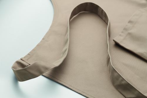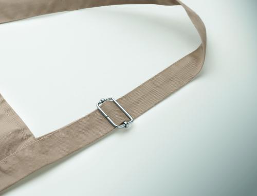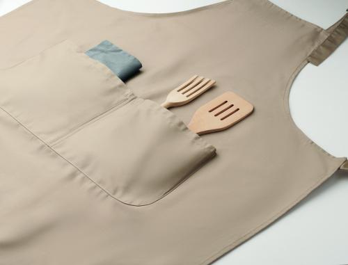 Long adjustable kitchen apron in 240 gr/m² polycotton (35% cotton, 65% polyester) with two front pockets and adjustable strap with metal buckle.