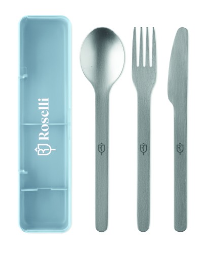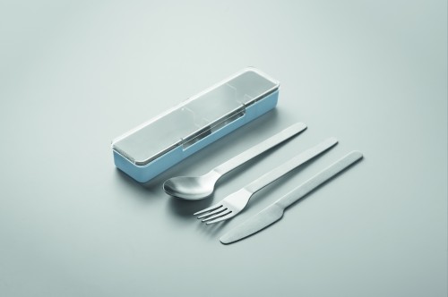 Stainless steel cutlery set with PP case. This set includes a fork, knife and spoon.