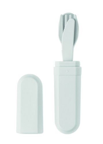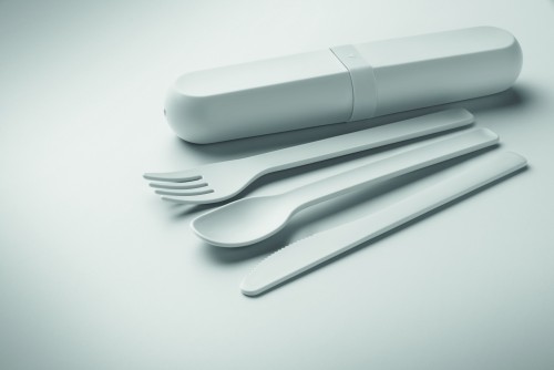 Reusable cutlery set with case in PLA corn. Each set includes a fork, a knife, a spoon and a practical portable utensils case.