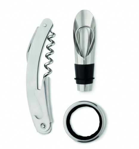 Wine set presented in bottle shaped box. With wine stopper, corkscrew and anti drip collar. Magnetic closing.