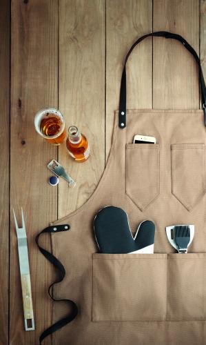 Apron in waxed canvas with leather details, adjustable strap with 2 chest pockets and 1 large low level pocket. 12oz Waxed Canvas.