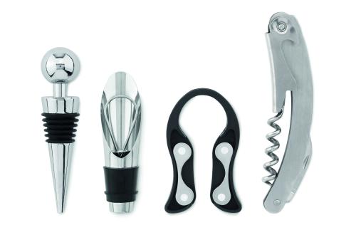 Wooden stand with 4 wine accessories. Including: waiters knife, wine stopper, wine pourer with stopper and foil cutter.