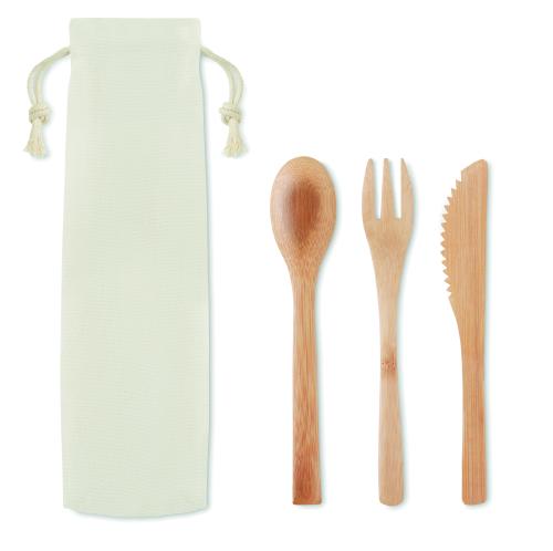 Re-usable bamboo cutlery set in canvas pouch. Includes knife, fork and spoon. Bamboo is a natural product, there may be slight variations in colour and size per item, which can affect the final decoration outcome.