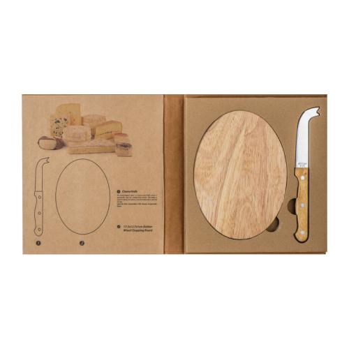 Cheese set in a sturdy cardboard gift box, includes a round wooden board and a cheese knife made of stainless steel.