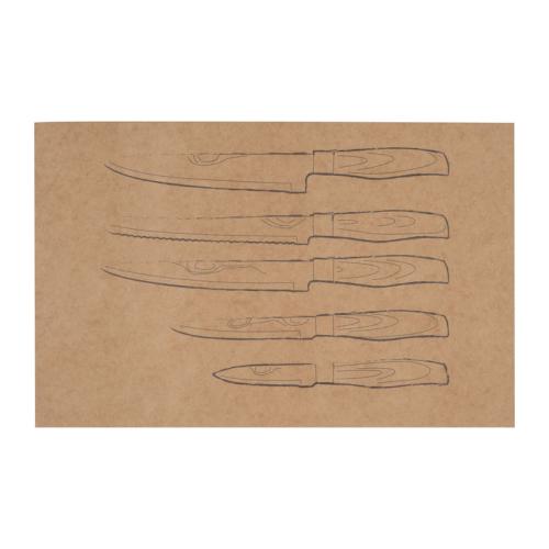 5-piece knife set. The knives in different sizes have a non-slip wood-looking handle and stainless steel cutting edge.