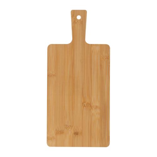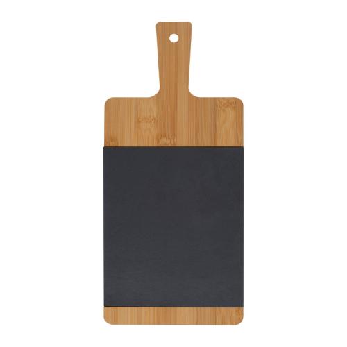 Bamboo serving board with slate insert, carrying handle and eyelet for hanging.