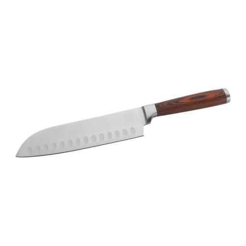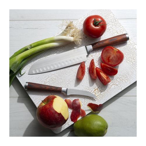 Quality set of two exclusive kitchen knives made of German steel. One of these knives is the Santoku knife, whose name can be translated as three virtues or purposes. It can be used to perfectly slice, dice and mince Vegetables, fish and boneless meat. Its thinner, very sharp and smooth blade prevents loosing juices while slicing meat and fruits. The second knife is a paring vegetable knife in the same design. Its curved blade makes it very easy to peel food without unnecessary excess. Packed in a Vanilla Season gift box.
