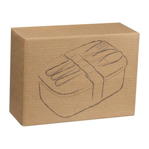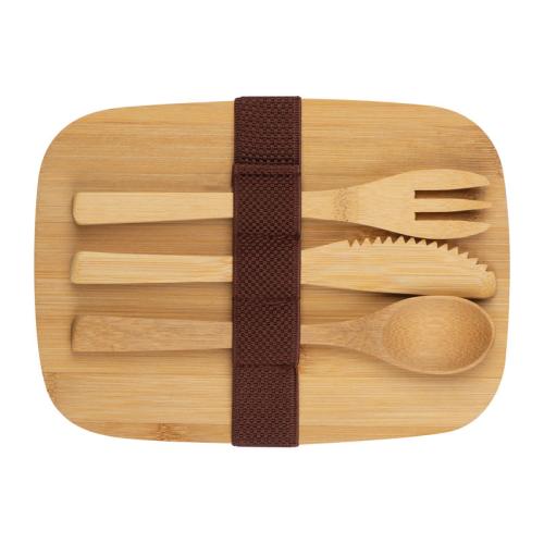 Stainless steel lunchbox with bamboo lid, bamboo cutlery and silicone strap to close.