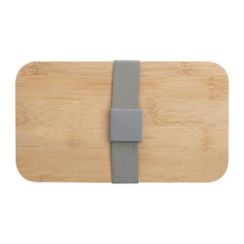 Two-tier lunch box with two separate compartments (both with their own lid), bamboo lid, a separator, knife, fork and a rubber band to close.