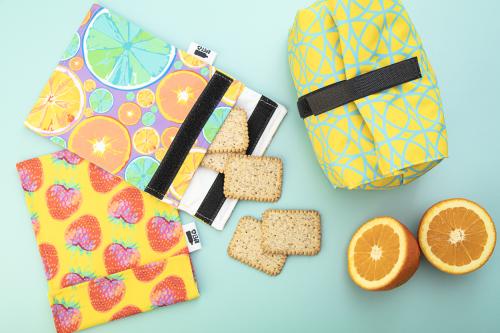 Custom made, reusable rolltop snack bag in 600D RPET polyester with durable waterproof lining and velcro closure. Ideal for wrapping snacks or a sandwich. With all over sublimation printed graphics. MOQ: 25 pcs.