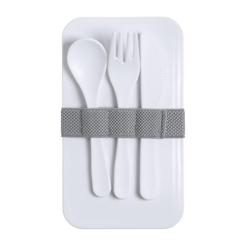 Lunch box in antibacterial plastic with cutlery set (fork, spoon and knife) and elastic strap. With 2 compartments of 700 ml capacity each. ISO 22196 compliant.