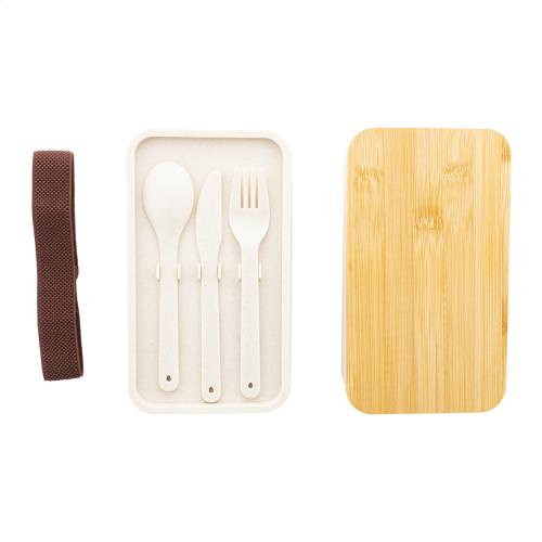 Lunch box in PP plastic with cutlery set (fork, spoon and knife), bamboo lid and elastic strap. With 2 compartments of 700 ml capacity each.