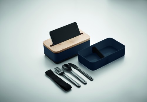 PP two-tier lunch box with removable divider and 3 cutlery utensils with attachable polyester band with bamboo lid. The lid has a phone stand functionality. Capacity: 400 ml (2x). Bamboo is a natural product, there may be slight variations in colour and size per item, which can affect the final decoration outcome.