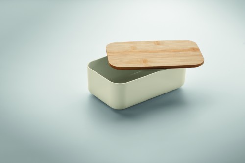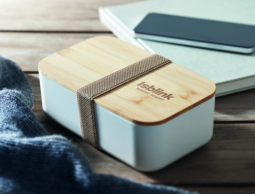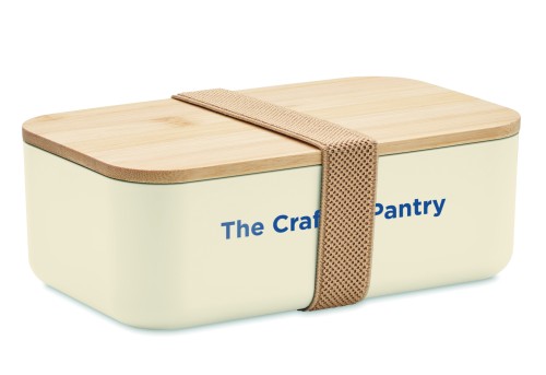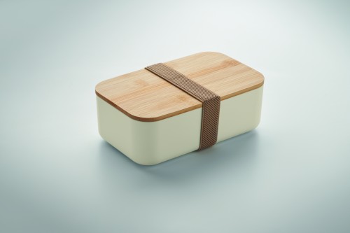 100% PLA corn lunch box with bamboo lid and RPET elastic band closure. Capacity : 1000 ml.
