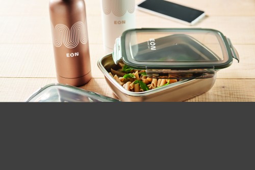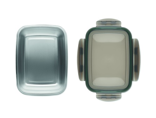 Recycled stainless steel lunch box with PP lid and 4 side clasp closure. Capacity: 850 ml.
