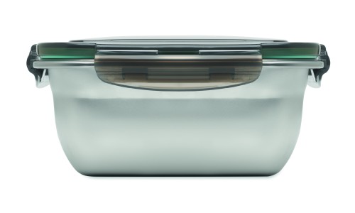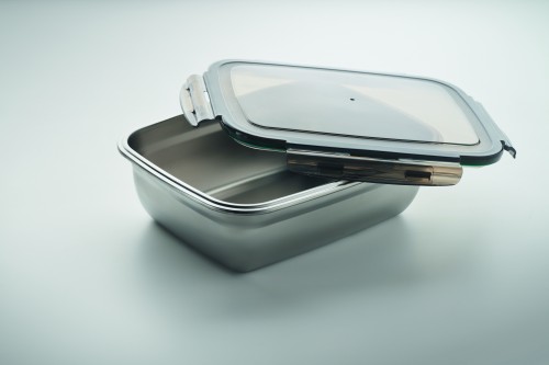 Recycled stainless steel lunch box with PP lid and 4 side clasp closure. Including separator. Capacity: 1500 ml.
