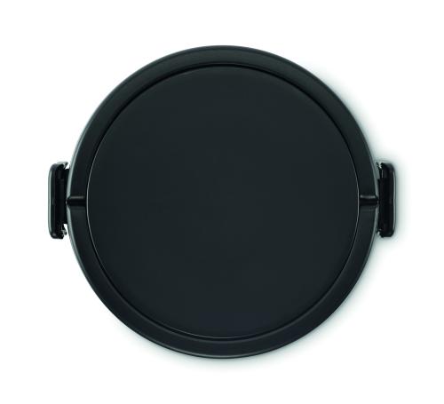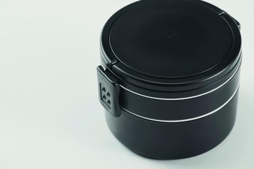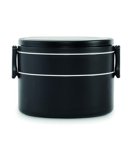 Two-tier round lunch box made of PP with side clip closure and handles. Includes inner lids. Capacity 250 ml top, 700 ml bottom.