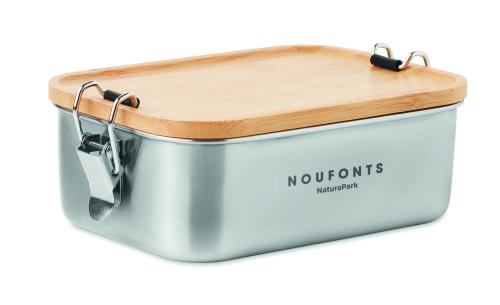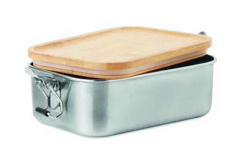 Stainless steel lunch box with side closure buckles and bamboo lid. Capacity: 750 ml. Bamboo is a natural product, there may be slight variations in colour and size per item, which can affect the final decoration outcome.