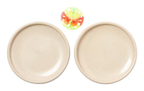 Beach game, including balls with suction cups and flat disc paddles in wheat straw plastic with elastic strap.