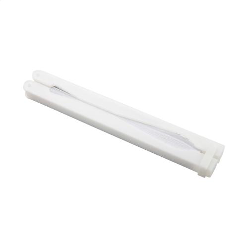 Paper hand fan with plastic stick.
