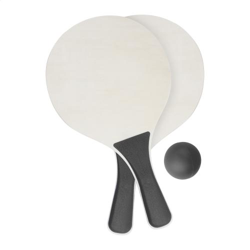 Beach tennis with 2 rackets and one ball, made of wood and plastic.