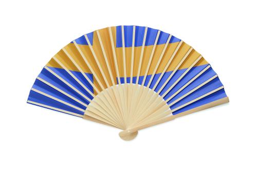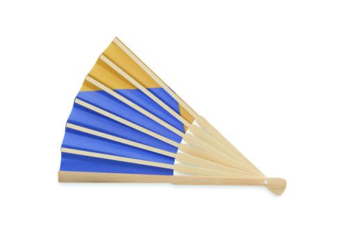 Manual hand fan in bamboo with flag design on paper fabric.