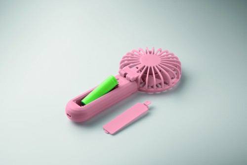 Portable foldable fan in ABS with 3 speed settings. Can be used as handheld or desk fan. Includes 1 replaceable and rechargeable 14500 Lithium battery 500 mAh.