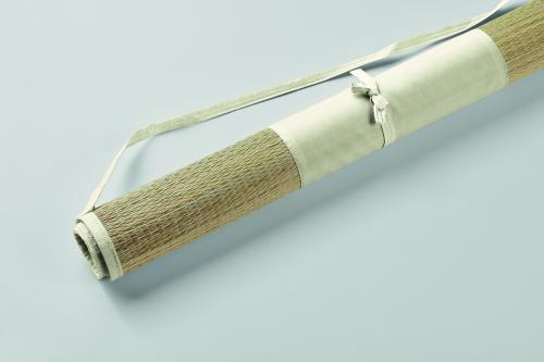 Natural straw roll up beach mat with polyester carry strap.