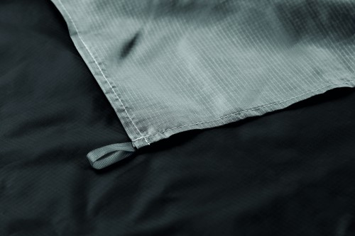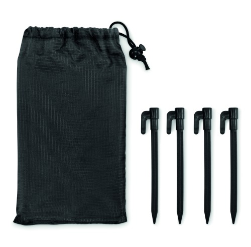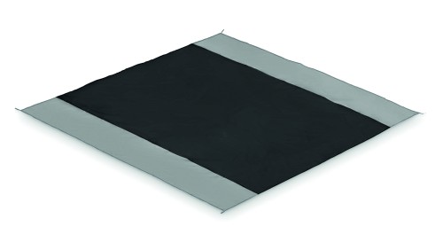 Lightweight beach mat in 210T polyester measuring 200x210cm. Includes 4 black hooks and a matching drawstring pouch for easy carrying.