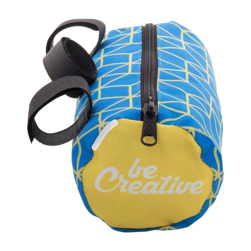 Custom made, zipped bicycle handlebar bag in 600D RPET polyester with adjustable velcro straps. With all-over sublimation printed graphics and distinctive RPET label. MOQ: 25 pcs.